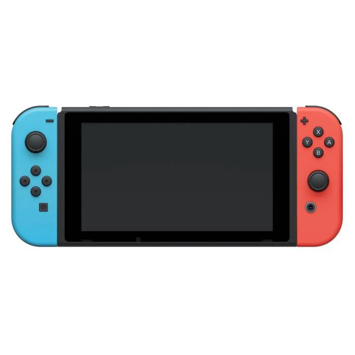 Nintendo Switch-systeem met een neonblauwe Joy-Con en een neonrode Joy-Con